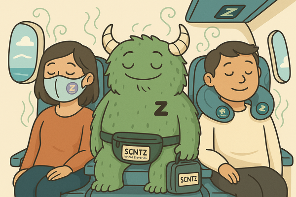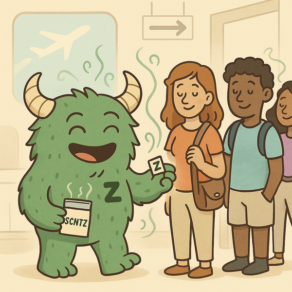 He found SCNTZ by Zed Travel Co. A simple solution: scented stick-on patches made for travel. Each one delivers hours of freshness - no plug, no spray, no fuss. Just peel, stick, breathe.